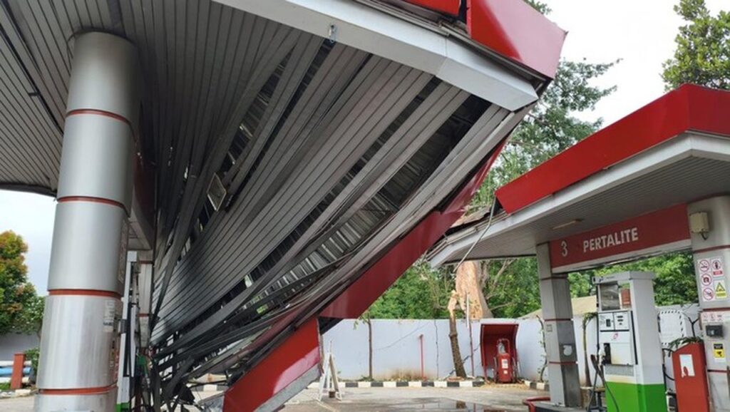 Kerusakan paling signifikan terlihat pada atap di area pengisian bahan bakar untuk mobil, yang juga berdekatan dengan jalur pengisian motor. Atap tersebut tampak miring dan patah akibat beban pohon yang menimpanya.