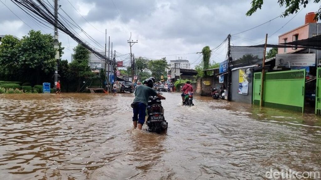 Jakarta – Banjir masih menggenangi Jalan Puri Kembangan, Jakarta Barat, pada Jumat (23/1/2026) siang. Ketinggian air dilaporkan mencapai 40 sentimeter akibat luapan air dari kali.