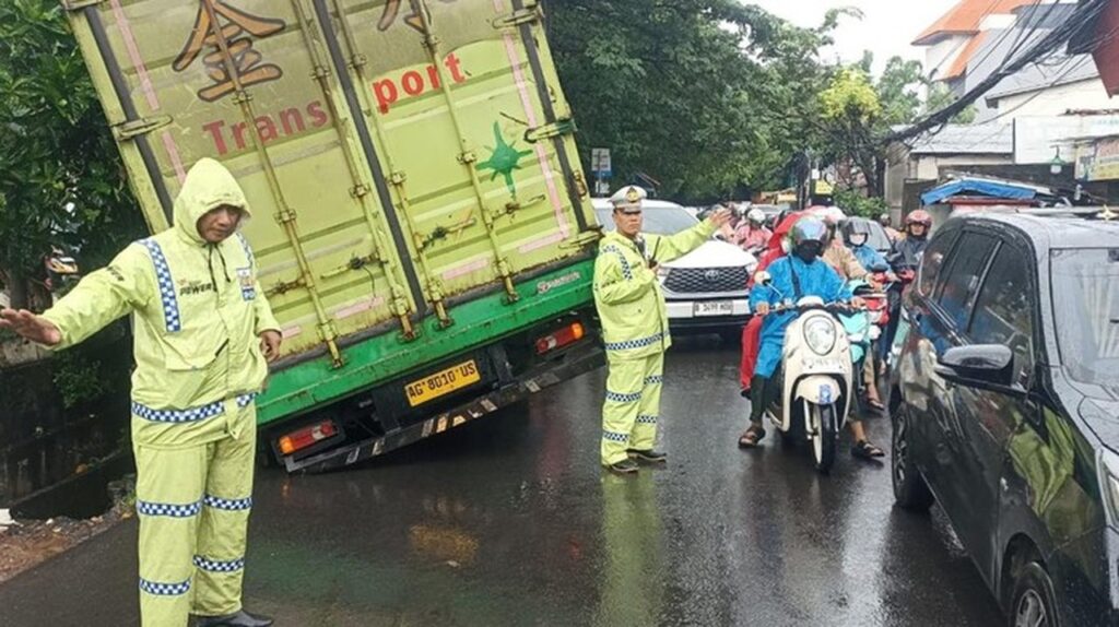 Informasi mengenai insiden ini pertama kali disampaikan melalui akun X TMC Polda Metro Jaya. Dalam unggahannya, terlihat truk Fuso tersebut ‘nangkring’ di bahu jalan dengan roda kiri bagian belakang masuk ke dalam selokan.